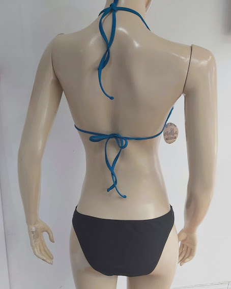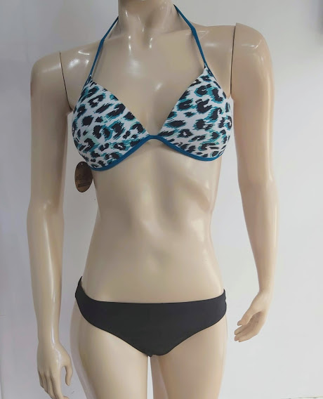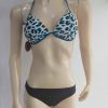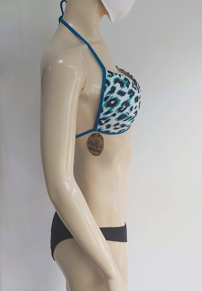 Bikini Ocalha con sostén prehormado con push up con estampado tipo animal print anudado al cuello y espalda con calzón negro.