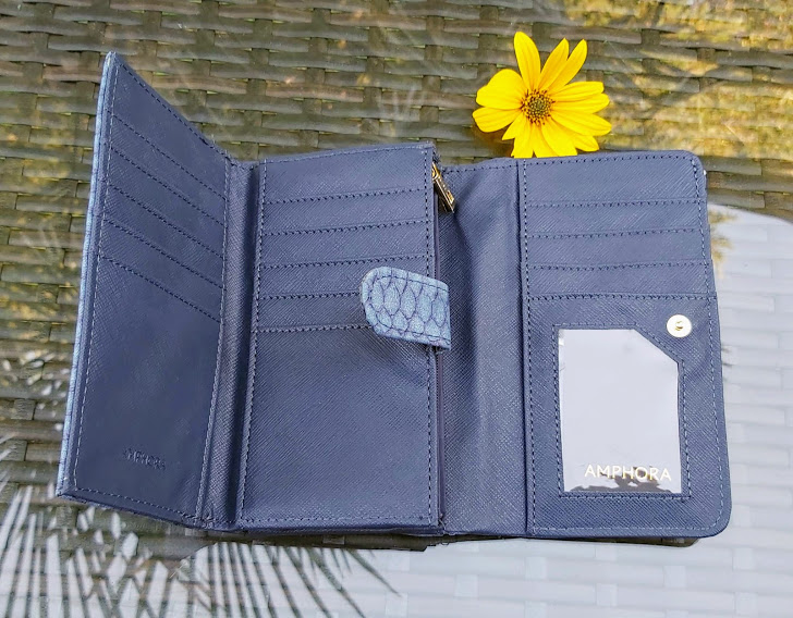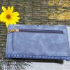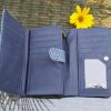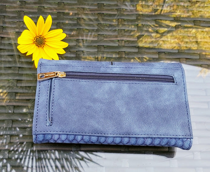 Billetera Amphora, modelo Alisha en color azul mediana con tachas doradas en la parte frontal. Tarjetero y dos cierres interiores más un cierre exterior.
