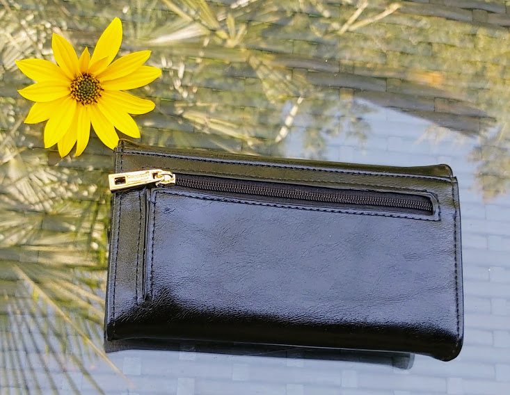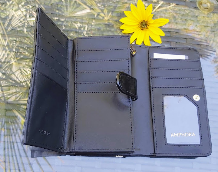 Billetera Amphora, modelo Laitina en negro de tamaño mediano, tipo acordeón. Con tarjetero y dos cierres interiores con un cierre exterior.