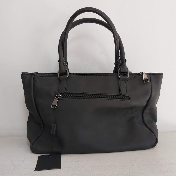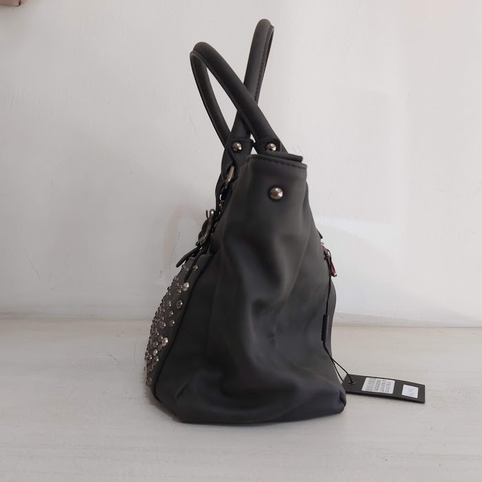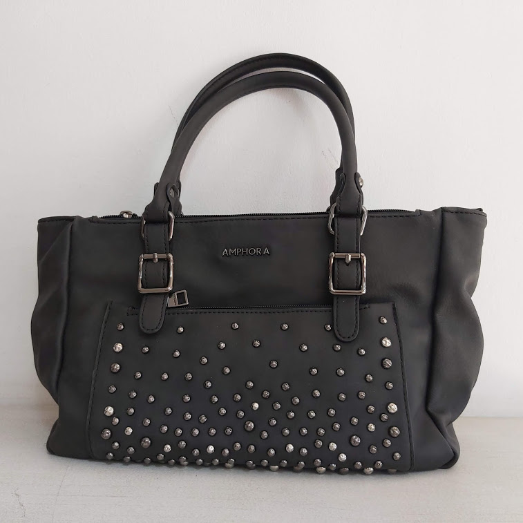 Cartera Amphora, modelo Lelaina negra con tachas en la parte delantera, con tres divisiones y dos asas. Incluye correa larga.