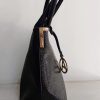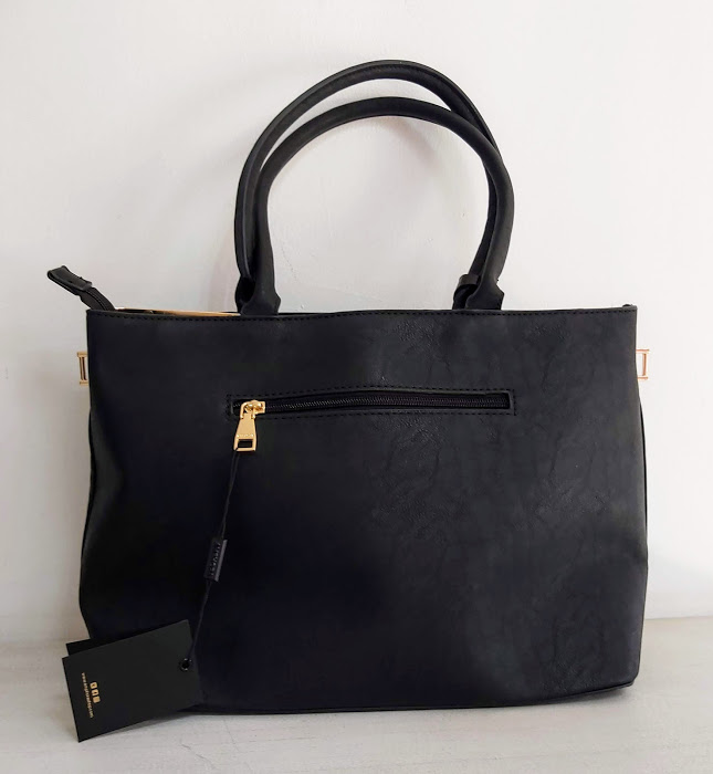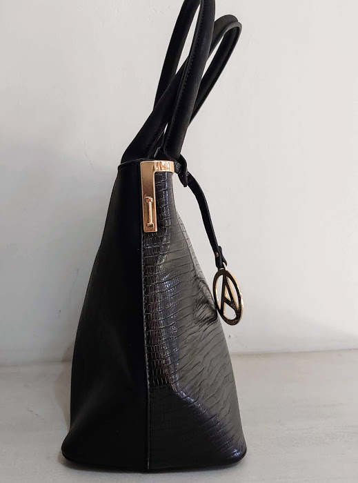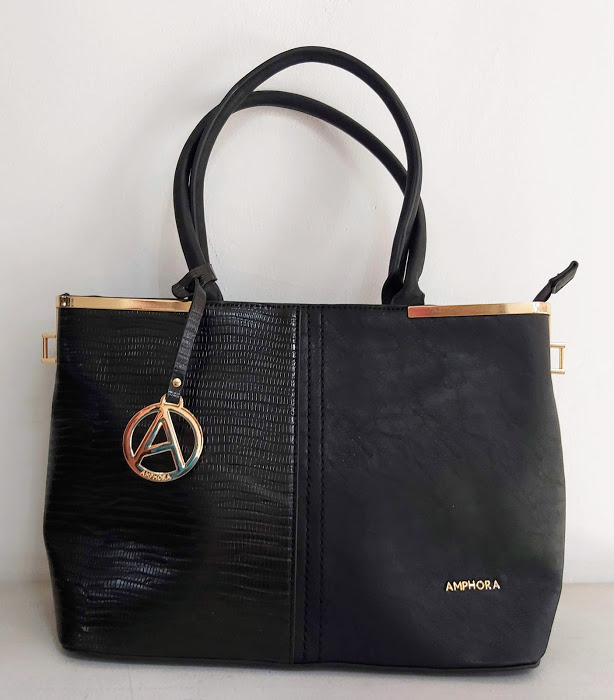 Cartera Amphora, modelo Naia negra dos asas tres divisiones con detalles en dorado. Incluye correa larga.