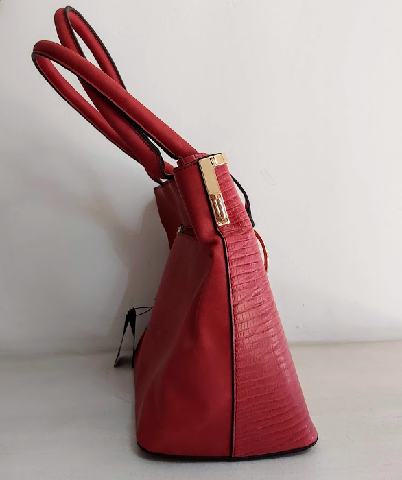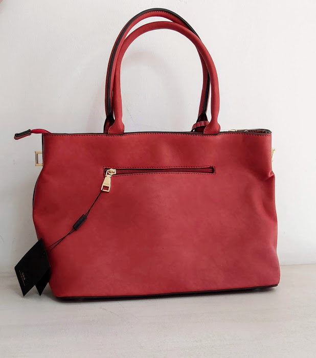 Cartera Amphora, modelo Naia roja, dos asas, tres divisiones y detalles en dorado. Incluye correa larga