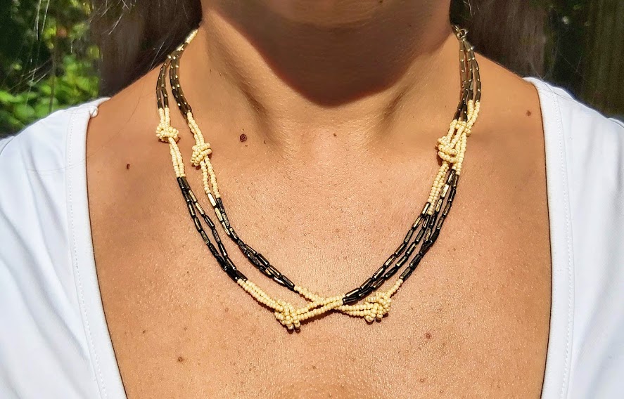 Collar Umbrale largo con pequeñas perlas y dorado con nudos y broche. Se puede usar largo o doble.