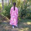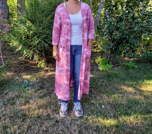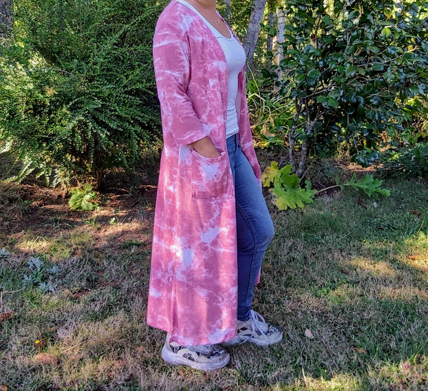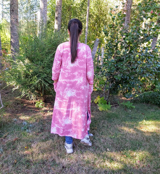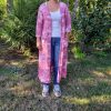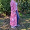 Tapado Malákh largo estampado, en color rojo y blanco, con manga 3/4, bolsillos y aberturas laterales.