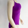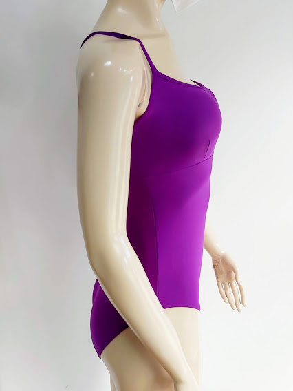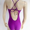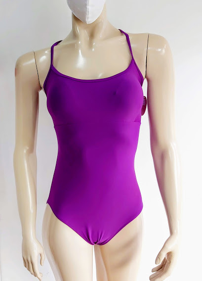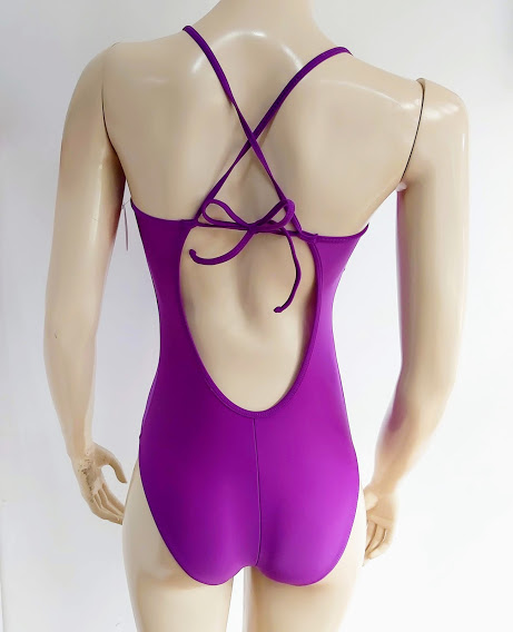 Traje de baño color morado, con corte bajo el busto. Cruzado y anudado en la espalda.