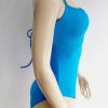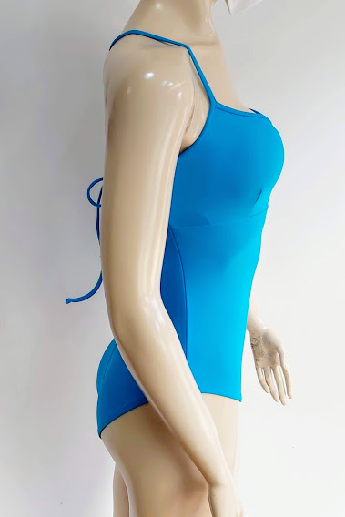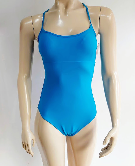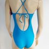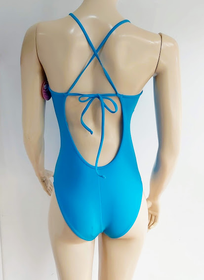 Traje de baño Ocalha de color turquesa, con corte bajo el busto . Cruzado y anudado en la espalda.